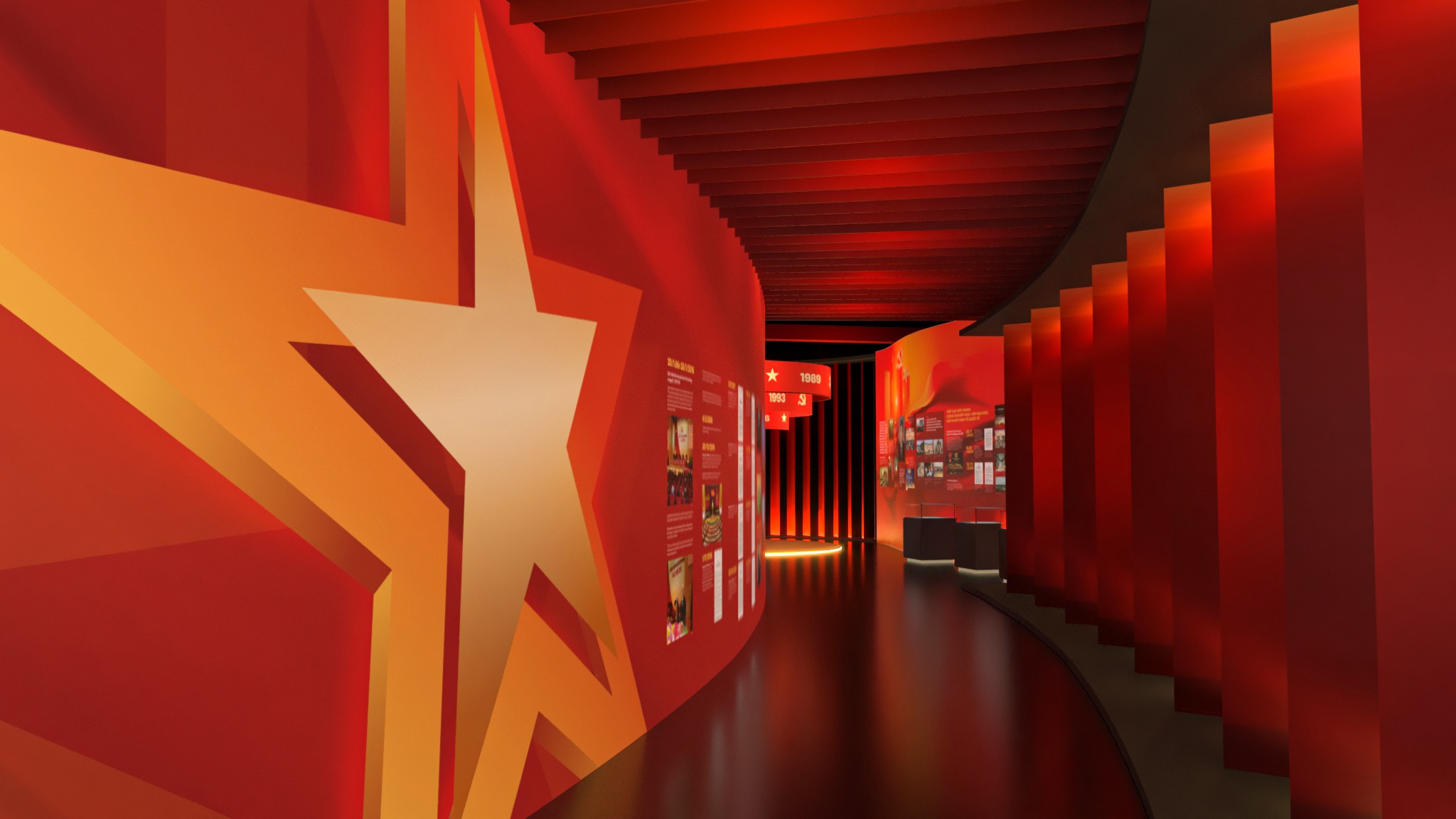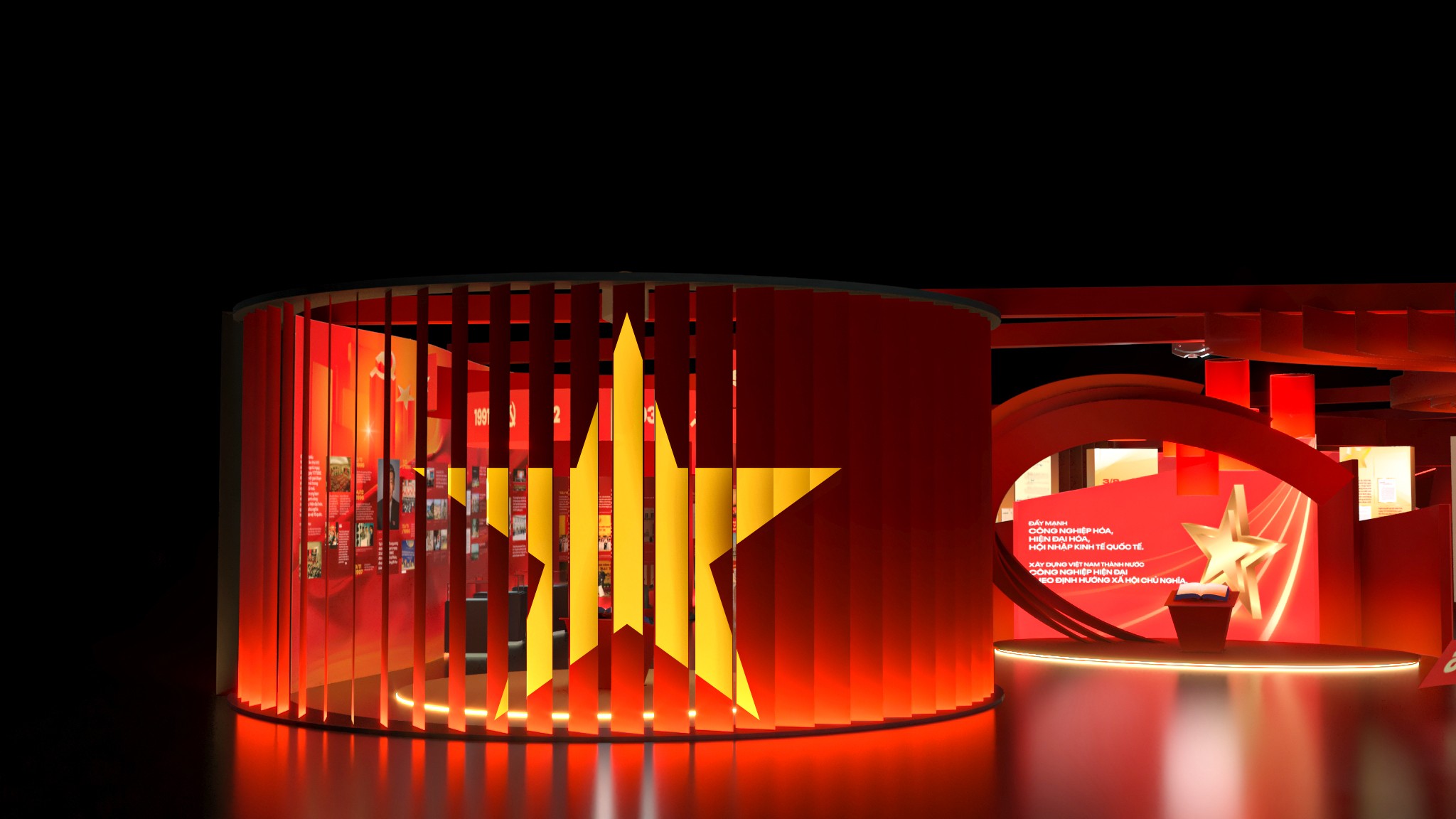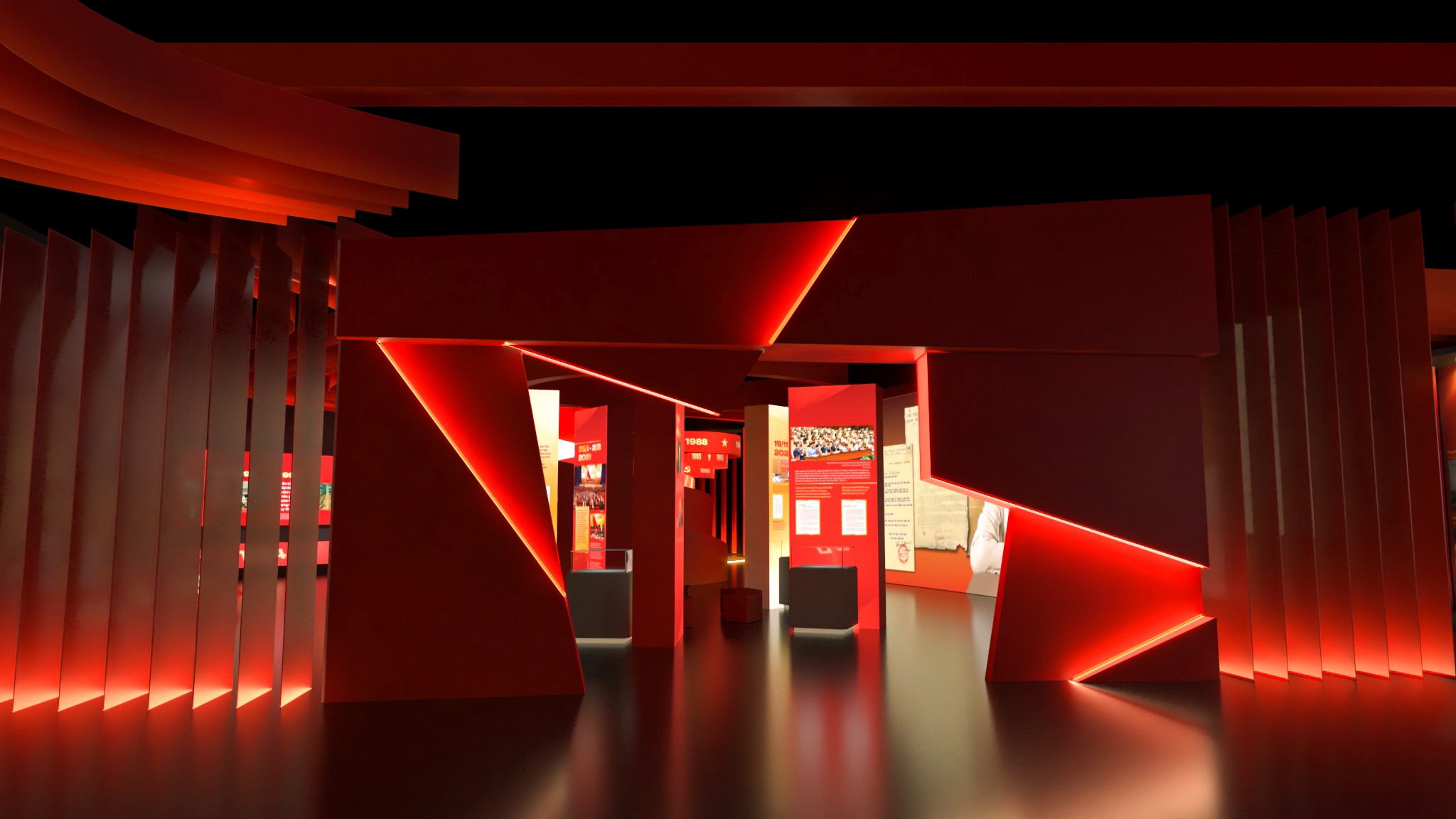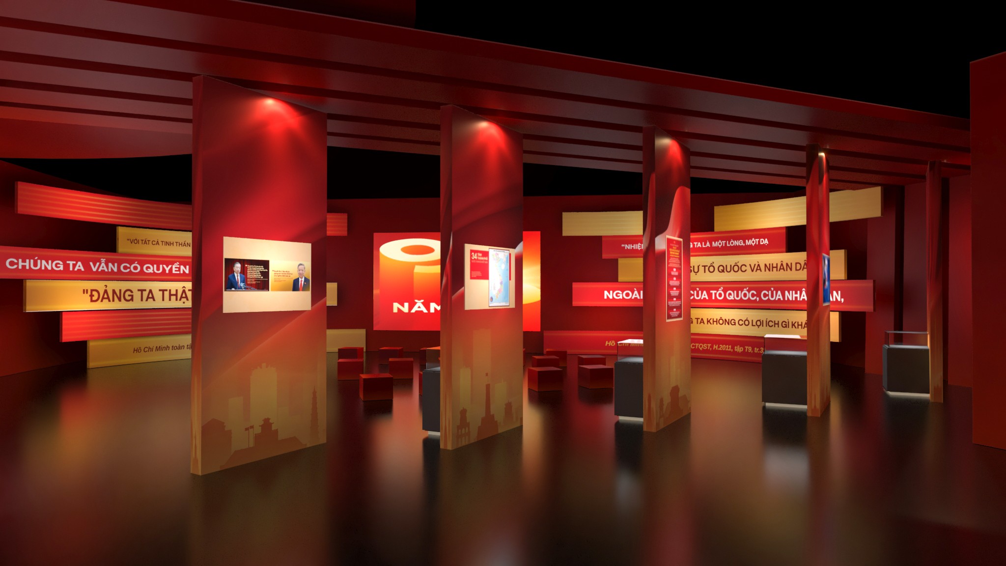Từ bản vẽ đến không gian thực, triển lãm được hiện thực hóa với tỷ lệ lớn, cấu trúc rõ ràng và nhịp không gian được kiểm soát chặt chẽ. Các lớp hình khối, ánh sáng và chất liệu phối hợp tạo nên một bối cảnh trưng bày vừa trang nghiêm, vừa giàu tính trải nghiệm. Hành trình di chuyển của người xem trở thành một phần của câu chuyện, nơi từng bước chân đi qua là từng lát cắt lịch sử được mở ra. Ánh sáng, màu sắc và nhịp không gian được xử lý để dẫn dắt cảm xúc – từ lắng đọng, suy ngẫm đến cao trào – giúp lịch sử không chỉ được nhìn thấy, mà còn được cảm nhận bằng giác quan.