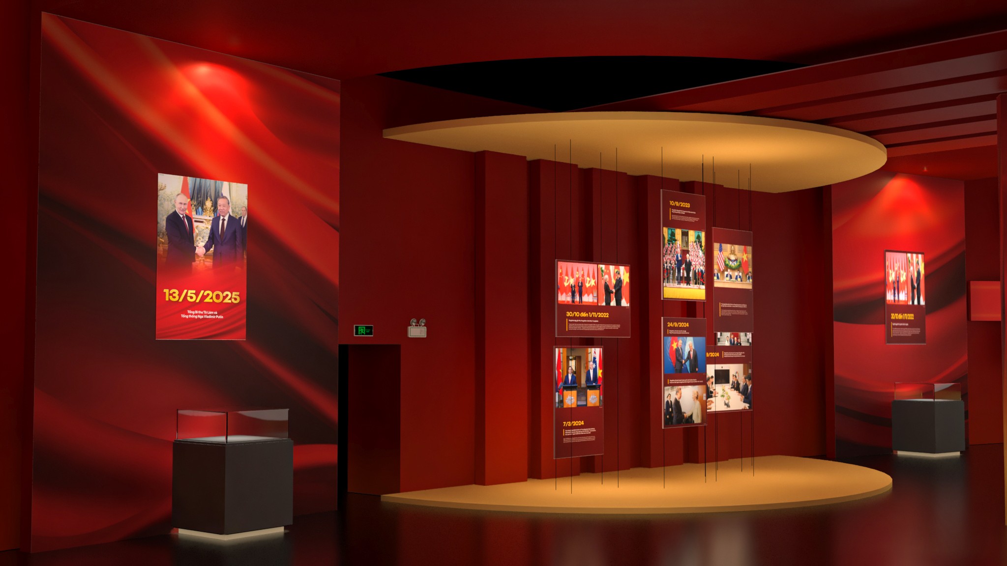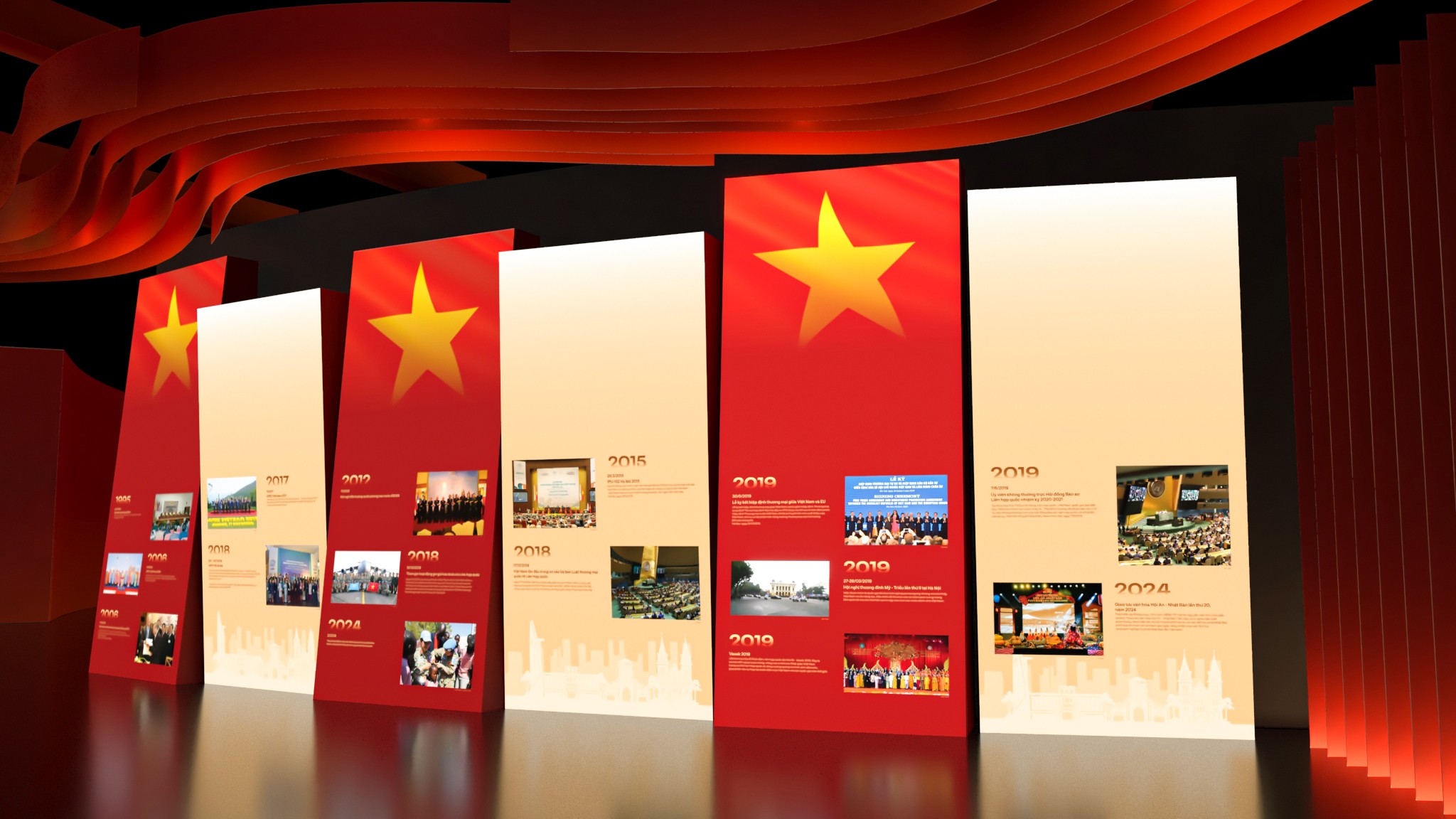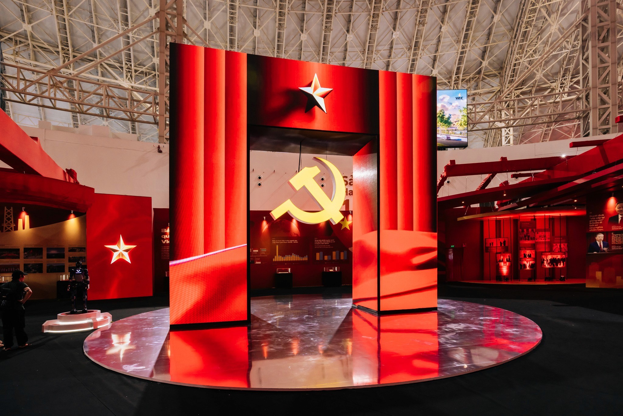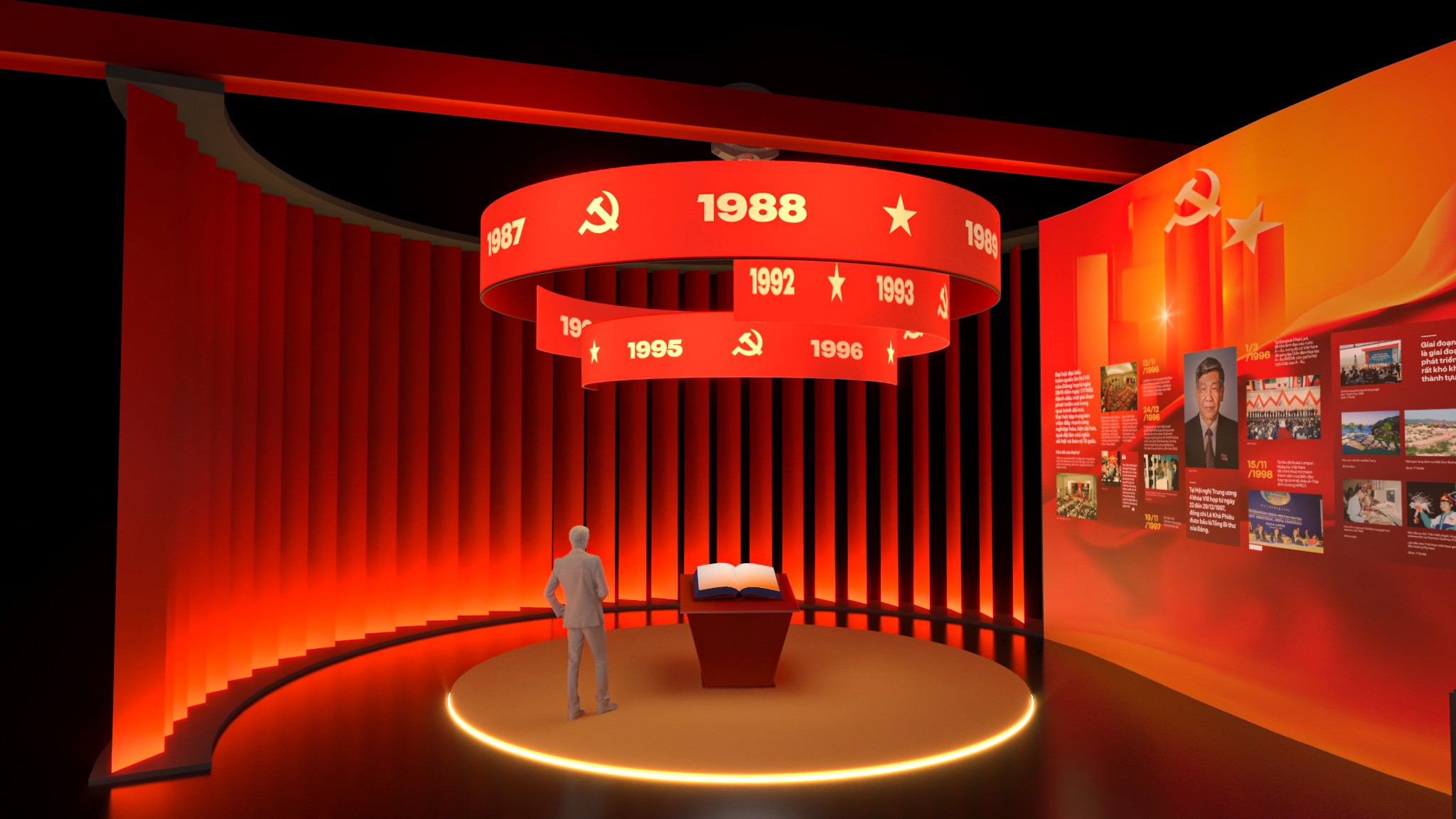 Từ bản vẽ đến không gian thực, triển lãm được hiện thực hóa với tỷ lệ lớn, cấu trúc rõ ràng và nhịp không gian được kiểm soát chặt chẽ. Các lớp hình khối, ánh sáng và chất liệu phối hợp tạo nên một bối cảnh trưng bày vừa trang nghiêm, vừa giàu tính trải nghiệm. Hành trình di chuyển của người xem trở thành một phần của câu chuyện, nơi từng bước chân đi qua là từng lát cắt lịch sử được mở ra. Ánh sáng, màu sắc và nhịp không gian được xử lý để dẫn dắt cảm xúc – từ lắng đọng, suy ngẫm đến cao trào – giúp lịch sử không chỉ được nhìn thấy, mà còn được cảm nhận bằng giác quan.