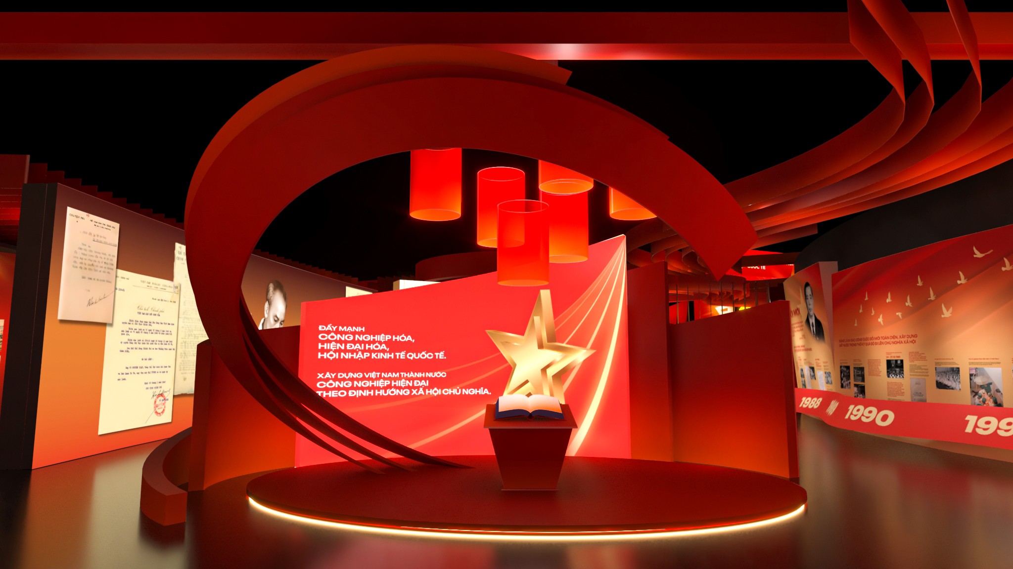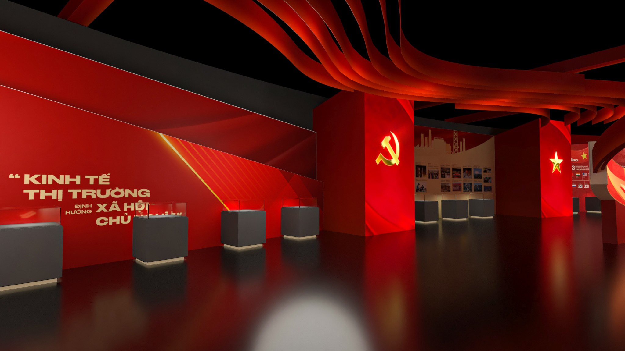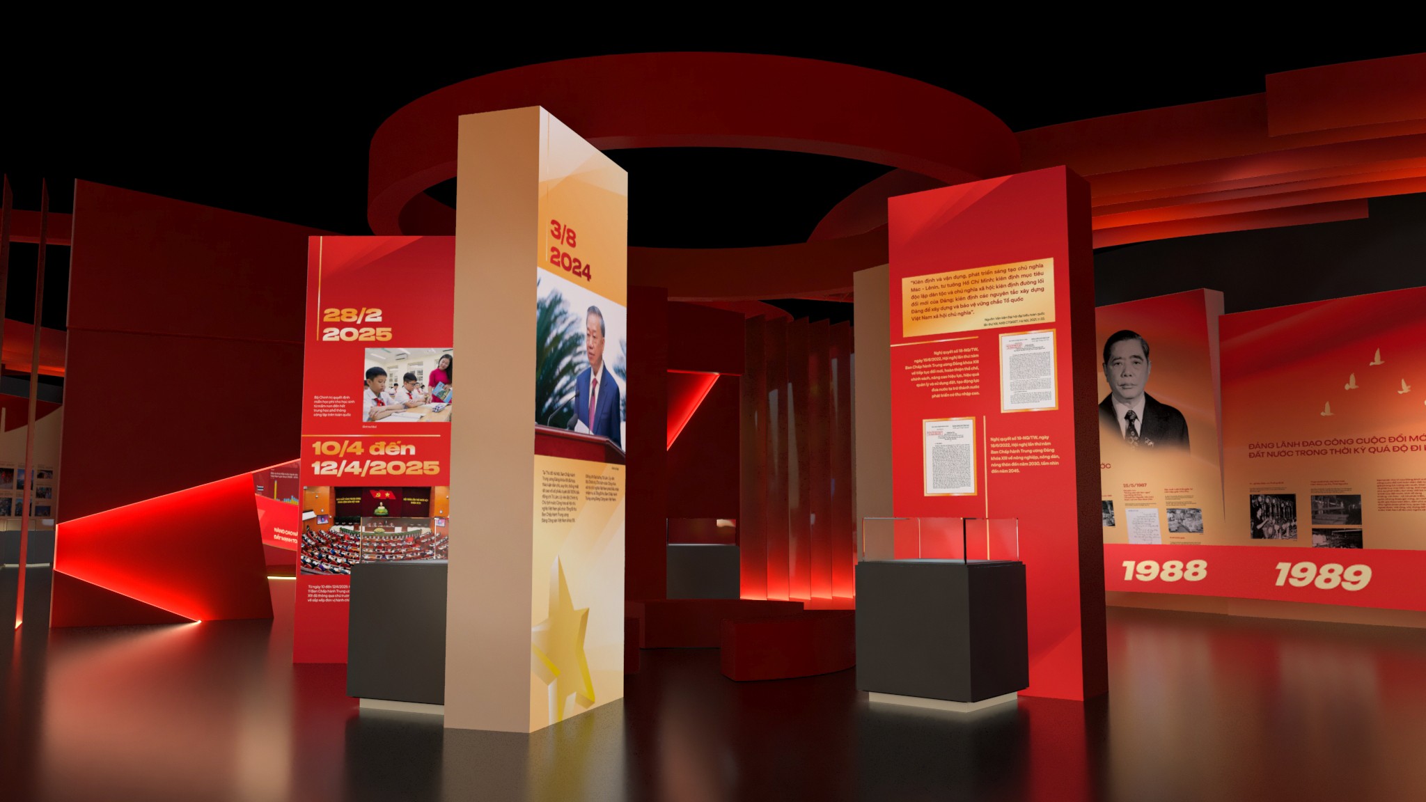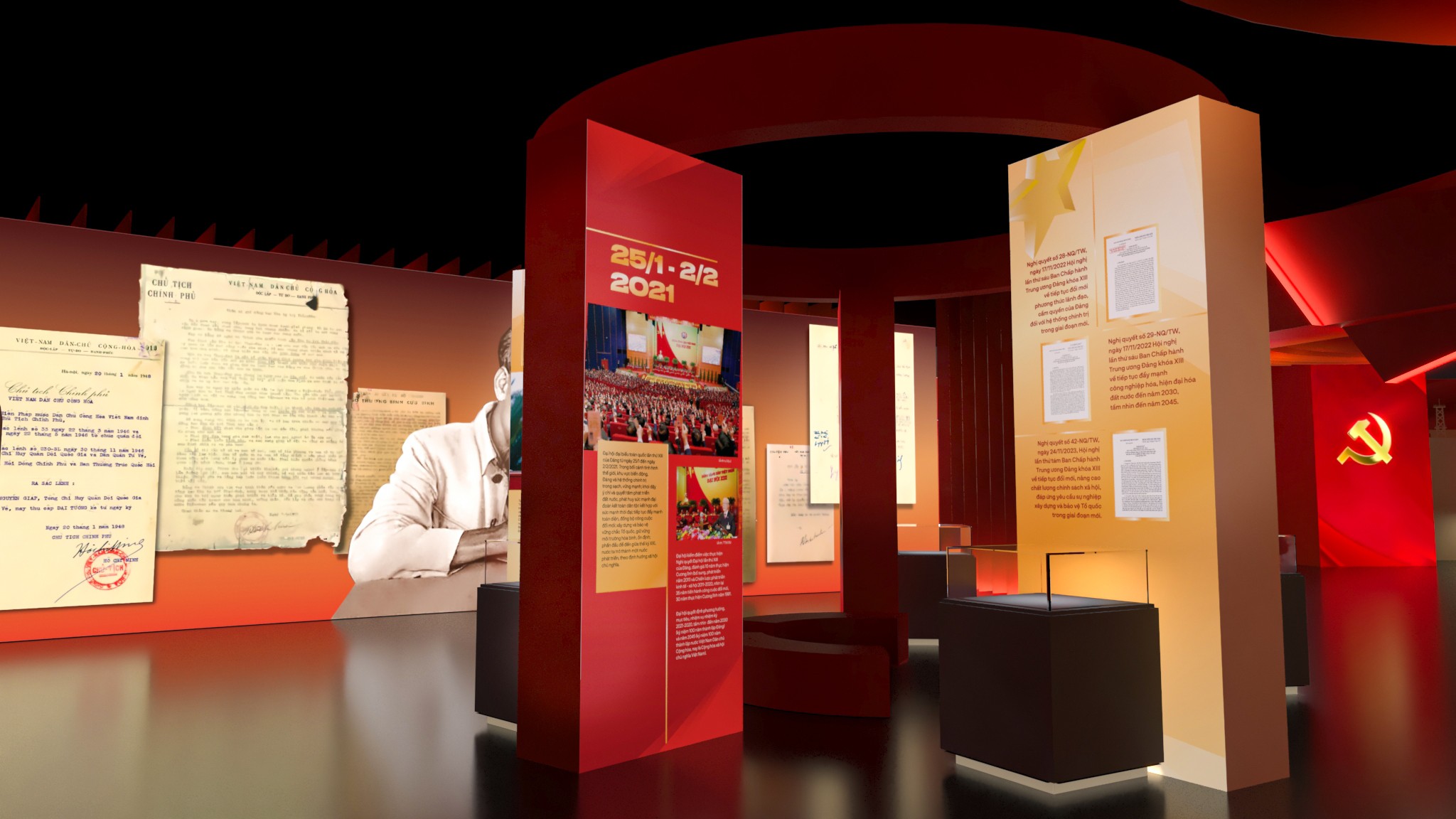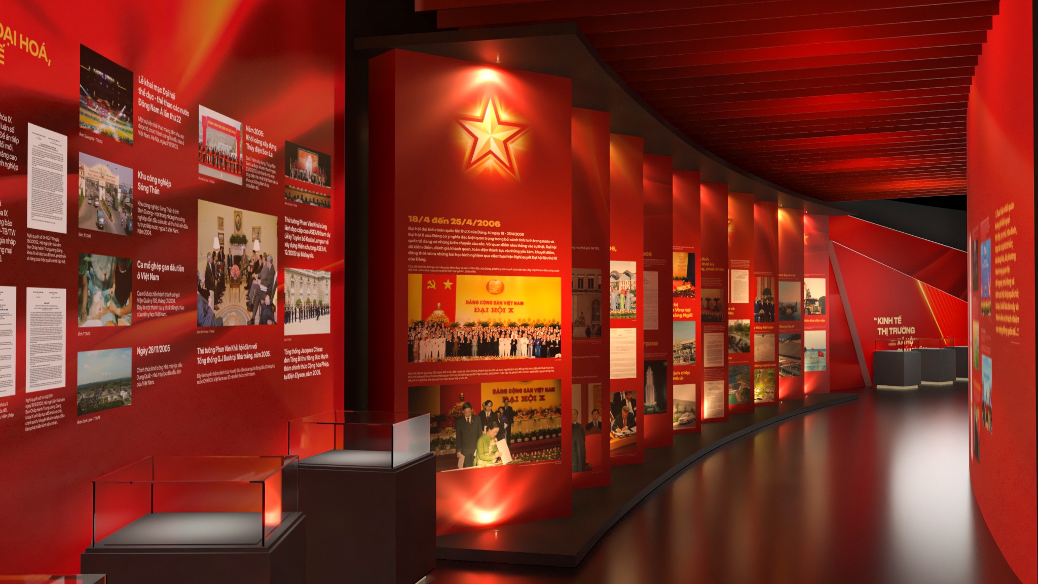 Phân khu 4 – Khởi nguồn và định hướng cách mạng Phân khu 4 tập trung vào giai đoạn hình thành và những định hướng ban đầu của Đảng. Thiết kế sử dụng bố cục tuyến tính, nhấn mạnh vào tính nền tảng và định hướng, với các mảng thông tin được sắp xếp theo trục thời gian rõ ràng. Ngôn ngữ hình khối tiết chế, ánh sáng vừa phải giúp người xem tập trung vào nội dung, tạo cảm giác trang nghiêm nhưng không xa cách. Phân khu 5 – Những dấu mốc và chuyển biến lịch sử Phân khu 5 là điểm nhấn về các kỳ Đại hội Đảng và những cột mốc quan trọng trong hành trình phát triển. Không gian được tổ chức theo dạng chuỗi sự kiện, nơi mỗi cụm trưng bày đại diện cho một giai đoạn chuyển mình của đất nước. Thiết kế tạo nhịp điệu rõ ràng hơn, giúp người xem cảm nhận được sự vận động liên tục của lịch sử, thay vì những mốc thời gian rời rạc. Phân khu 6 – Tiếp nối và định hướng tương lai Phân khu 6 khép lại hành trình bằng tinh thần tiếp nối và phát triển. Không gian mở hơn, bố cục thoáng hơn, phản ánh thông điệp về sự kế thừa, đổi mới và hướng tới tương lai. Thiết kế ở phân khu này đóng vai trò như một điểm “lắng”, nơi người xem có thể nhìn lại toàn bộ hành trình đã đi qua trước khi rời khỏi không gian triển lãm.
