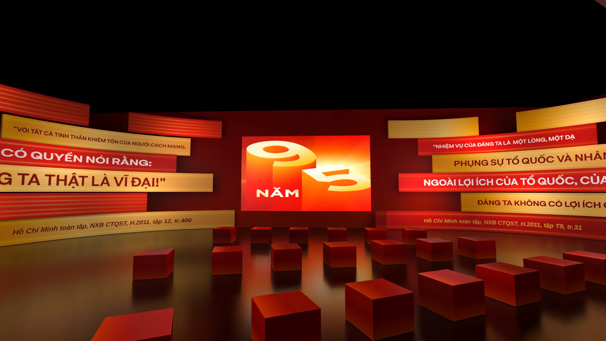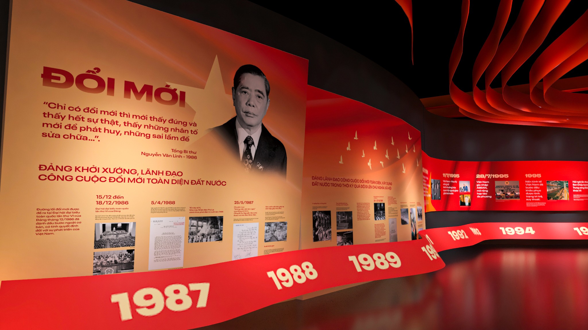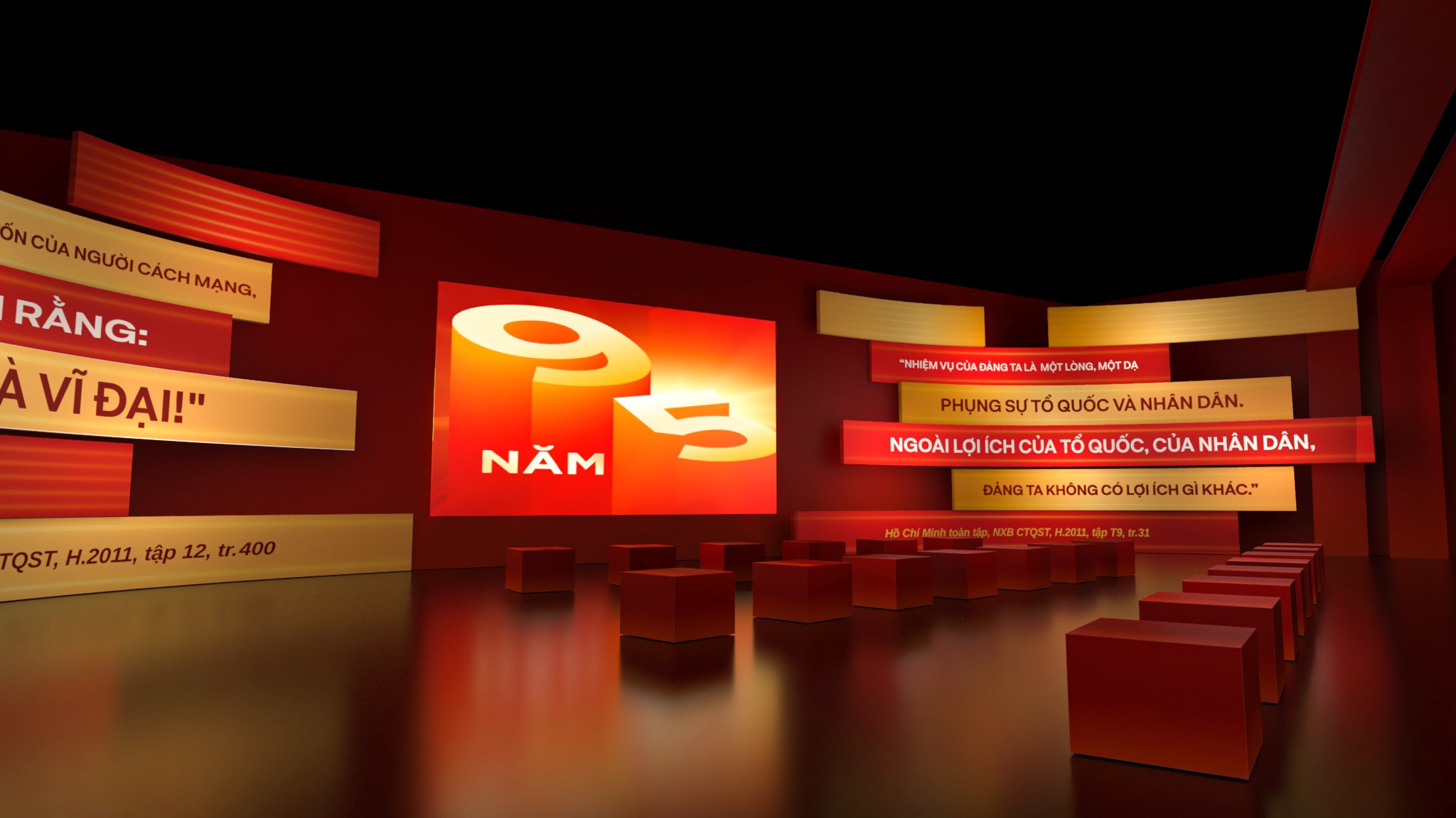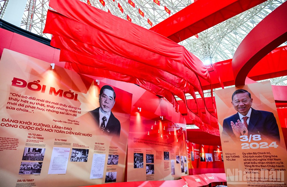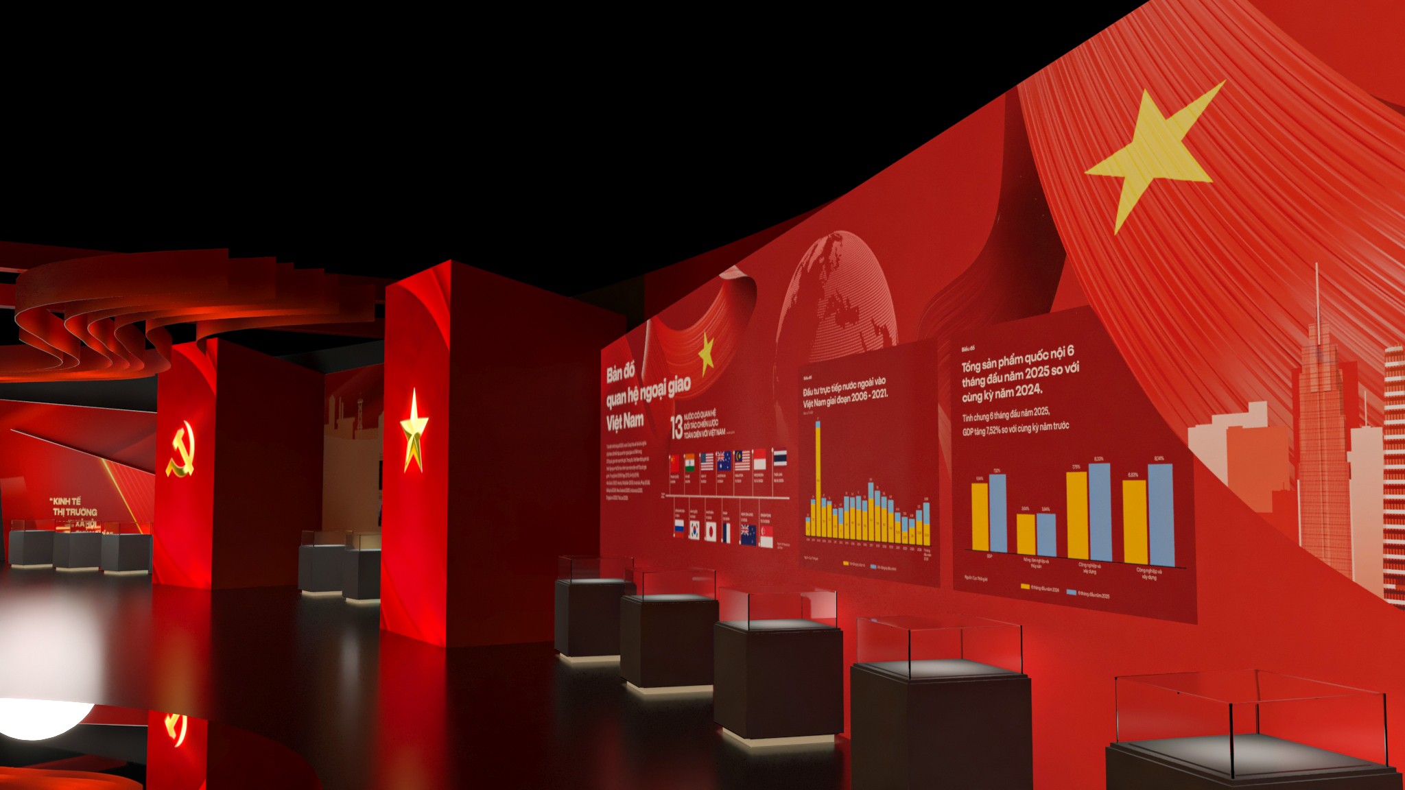 Phân khu 4 – Khởi nguồn và định hướng cách mạng Phân khu 4 tập trung vào giai đoạn hình thành và những định hướng ban đầu của Đảng. Thiết kế sử dụng bố cục tuyến tính, nhấn mạnh vào tính nền tảng và định hướng, với các mảng thông tin được sắp xếp theo trục thời gian rõ ràng. Ngôn ngữ hình khối tiết chế, ánh sáng vừa phải giúp người xem tập trung vào nội dung, tạo cảm giác trang nghiêm nhưng không xa cách. Phân khu 5 – Những dấu mốc và chuyển biến lịch sử Phân khu 5 là điểm nhấn về các kỳ Đại hội Đảng và những cột mốc quan trọng trong hành trình phát triển. Không gian được tổ chức theo dạng chuỗi sự kiện, nơi mỗi cụm trưng bày đại diện cho một giai đoạn chuyển mình của đất nước. Thiết kế tạo nhịp điệu rõ ràng hơn, giúp người xem cảm nhận được sự vận động liên tục của lịch sử, thay vì những mốc thời gian rời rạc. Phân khu 6 – Tiếp nối và định hướng tương lai Phân khu 6 khép lại hành trình bằng tinh thần tiếp nối và phát triển. Không gian mở hơn, bố cục thoáng hơn, phản ánh thông điệp về sự kế thừa, đổi mới và hướng tới tương lai. Thiết kế ở phân khu này đóng vai trò như một điểm “lắng”, nơi người xem có thể nhìn lại toàn bộ hành trình đã đi qua trước khi rời khỏi không gian triển lãm.