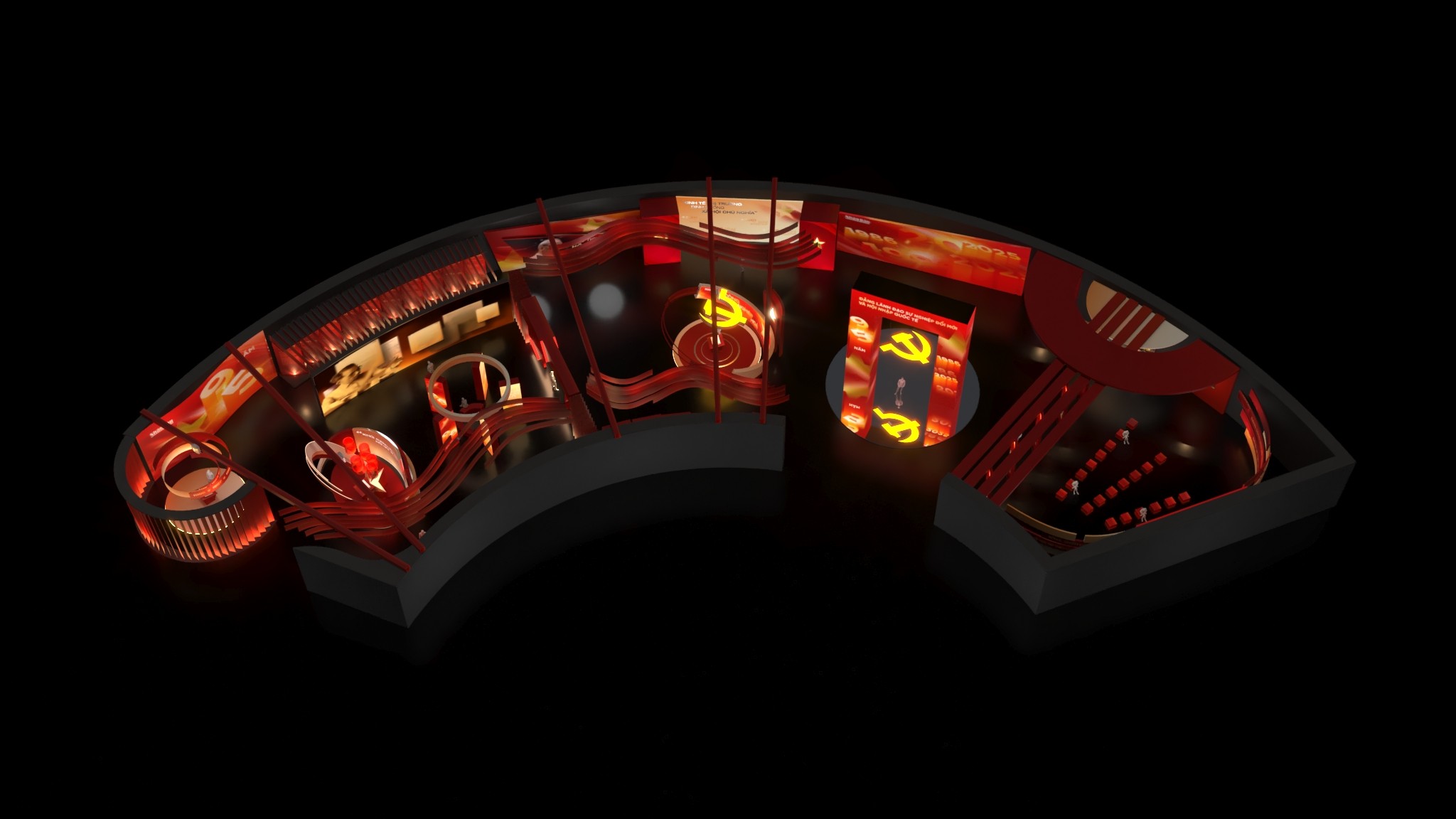 Trong diễn họa 3D, các mảng vách, khối trưng bày và hành lang được tạo hình với độ dày – độ sâu – nhịp lặp có chủ ý, gợi cảm giác như đang bước qua những lớp ký ức chồng lên nhau. Hình khối lớn, rõ ràng nhưng tiết chế chi tiết, giúp nội dung lịch sử trở thành trung tâm, thay vì bị che lấp bởi hình thức trang trí. Đường cong và vòng tròn xuất hiện xuyên suốt thiết kế, vừa mang tính biểu tượng, vừa đóng vai trò kết nối không gian – gợi mở hình ảnh của một hành trình liên tục, không đứt đoạn. Ánh sáng giữ vai trò dẫn chuyện, với sự chuyển đổi nhịp sáng – tối nhằm định hướng chuyển động, tạo điểm nhấn cảm xúc và dẫn dắt người xem đi sâu vào nội dung trưng bày. Thiết kế 3D trở thành nền tảng để hình ảnh, hiện vật và các lớp trình chiếu được hòa quyện, tạo nên một trải nghiệm immersive – nơi lịch sử được cảm nhận bằng không gian, không chỉ bằng lời kể.