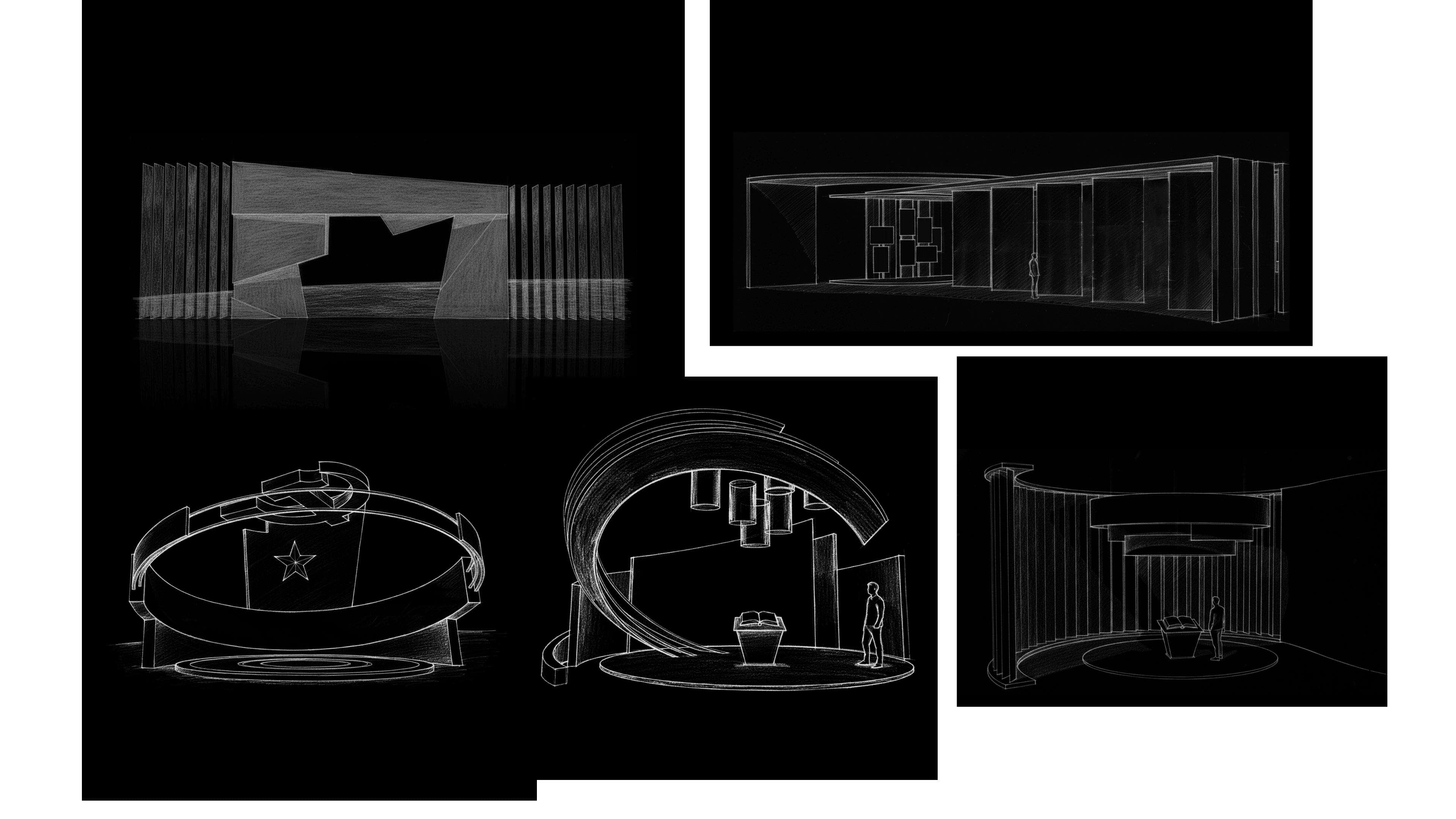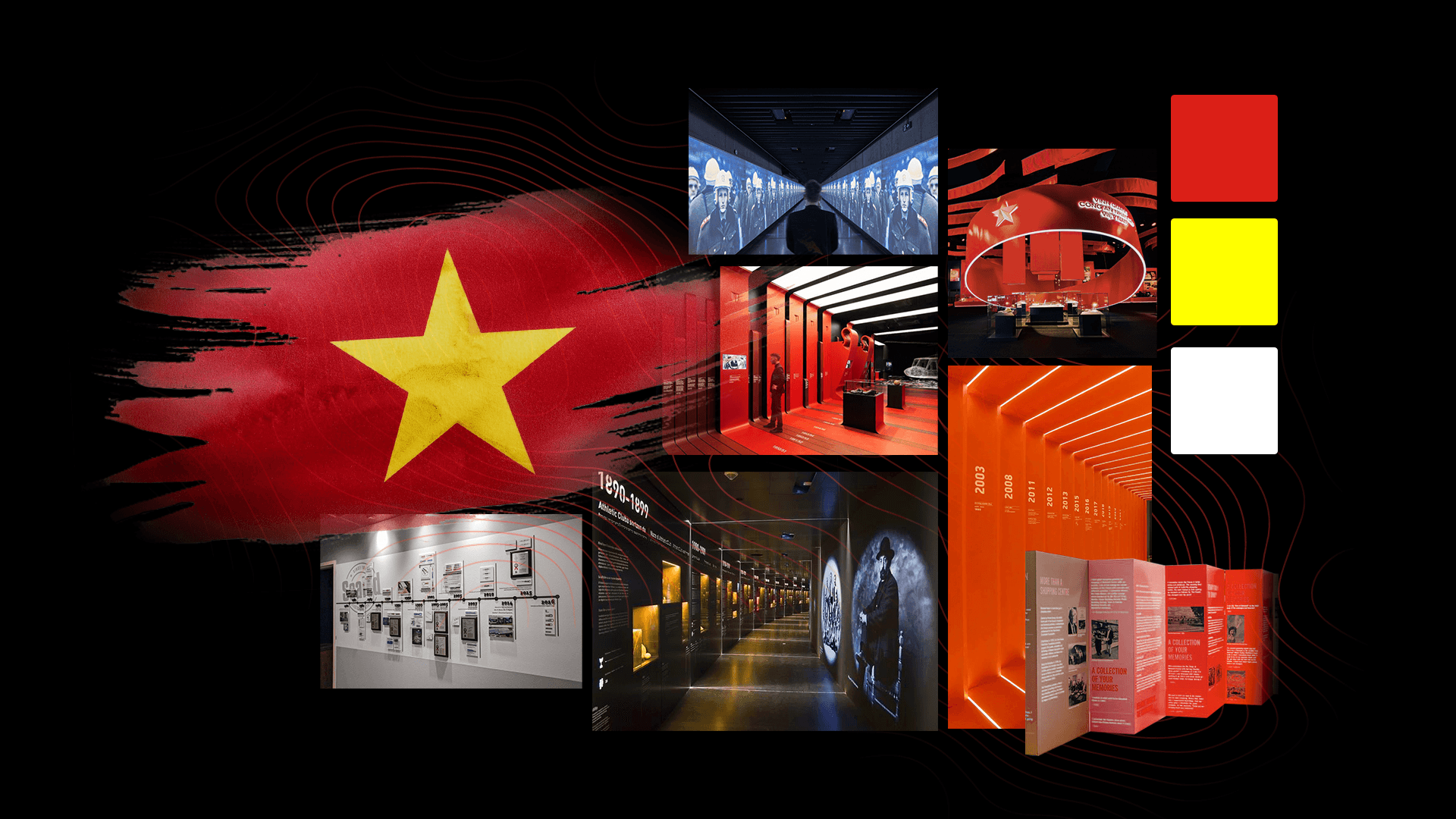Tổng thể moodboard không hướng tới sự hoành tráng thuần túy, mà tập trung xây dựng một không gian có nhịp điệu, có chiều sâu và có khả năng dẫn dắt cảm xúc. Lịch sử trong dự án này không đứng yên để ngắm nhìn, mà được cảm nhận qua chuyển động – ánh sáng – không gian, đúng với tinh thần “soi đường” xuyên suốt 95 năm. Ngôn ngữ hình khối trong moodboard thiên về đường cong, vòng tròn và cấu trúc tuyến tính kéo dài. Đây là chủ ý thiết kế nhằm: Gợi cảm giác dòng chảy liên tục của lịch sử / Tạo sự kết nối giữa các giai đoạn, thay vì chia cắt không gian / Dẫn dắt chuyển động của người xem theo một nhịp ổn định, có tiết tấu Các không gian hành lang, vách trưng bày và module thông tin được định hình như những “lớp ký ức” xếp chồng – mỗi lớp là một thời kỳ, một dấu mốc.