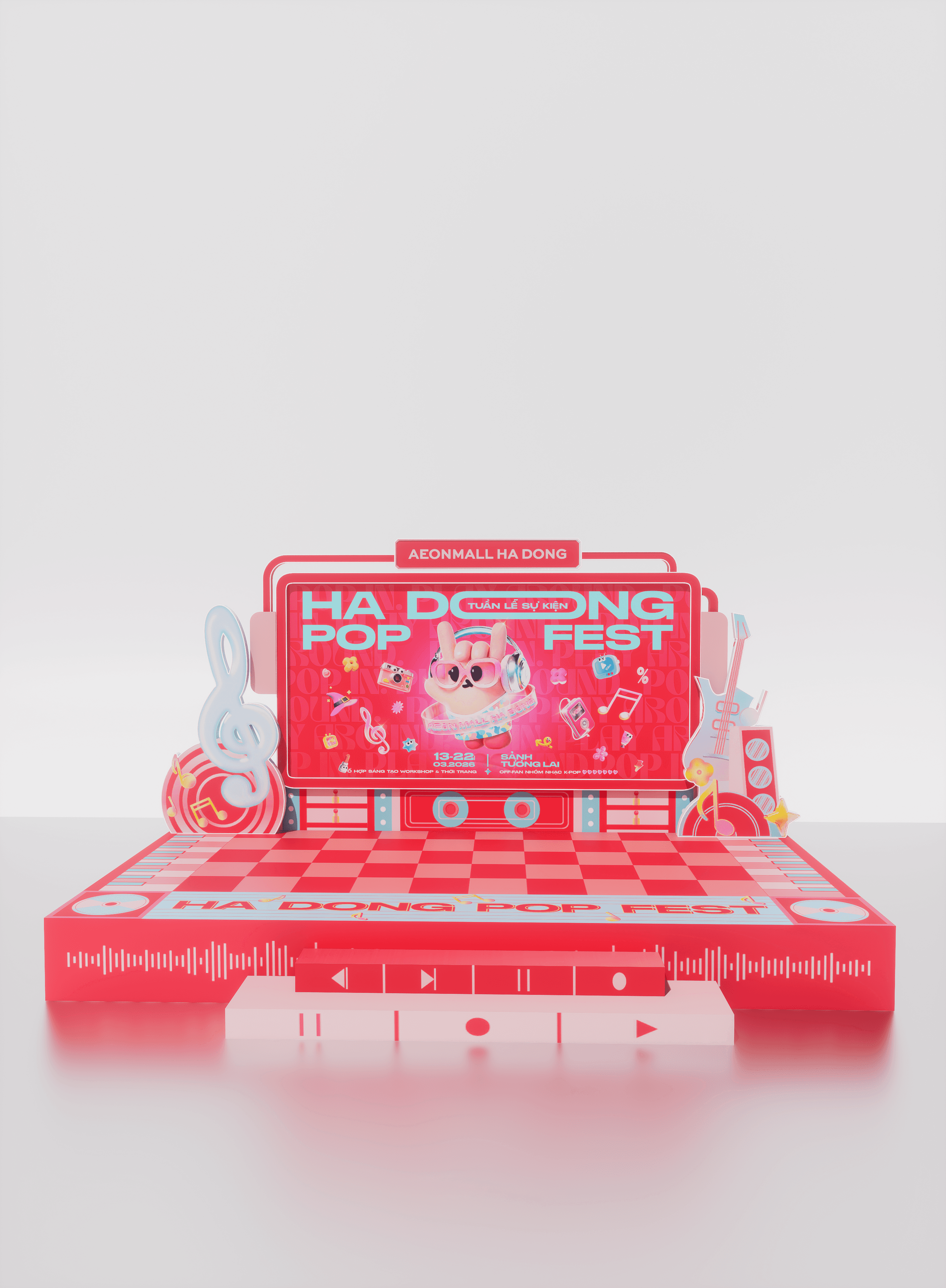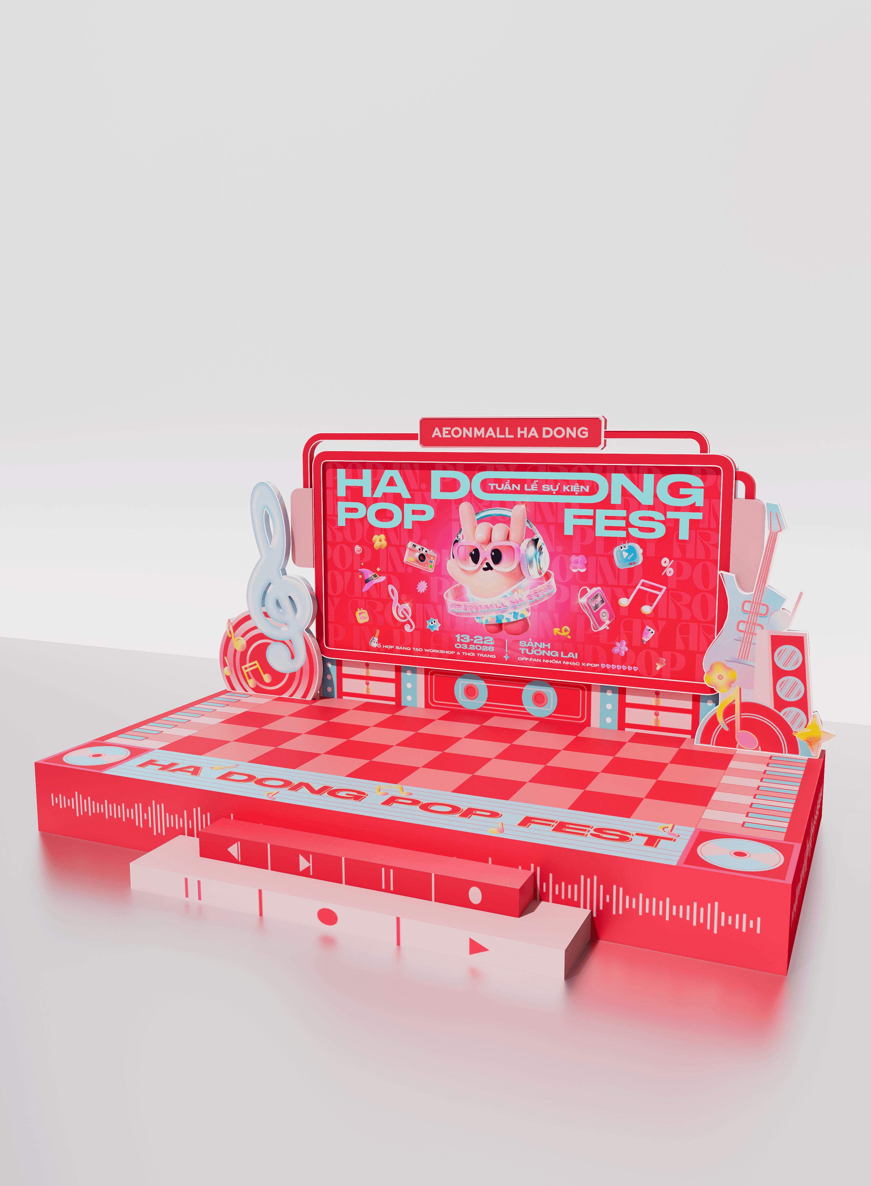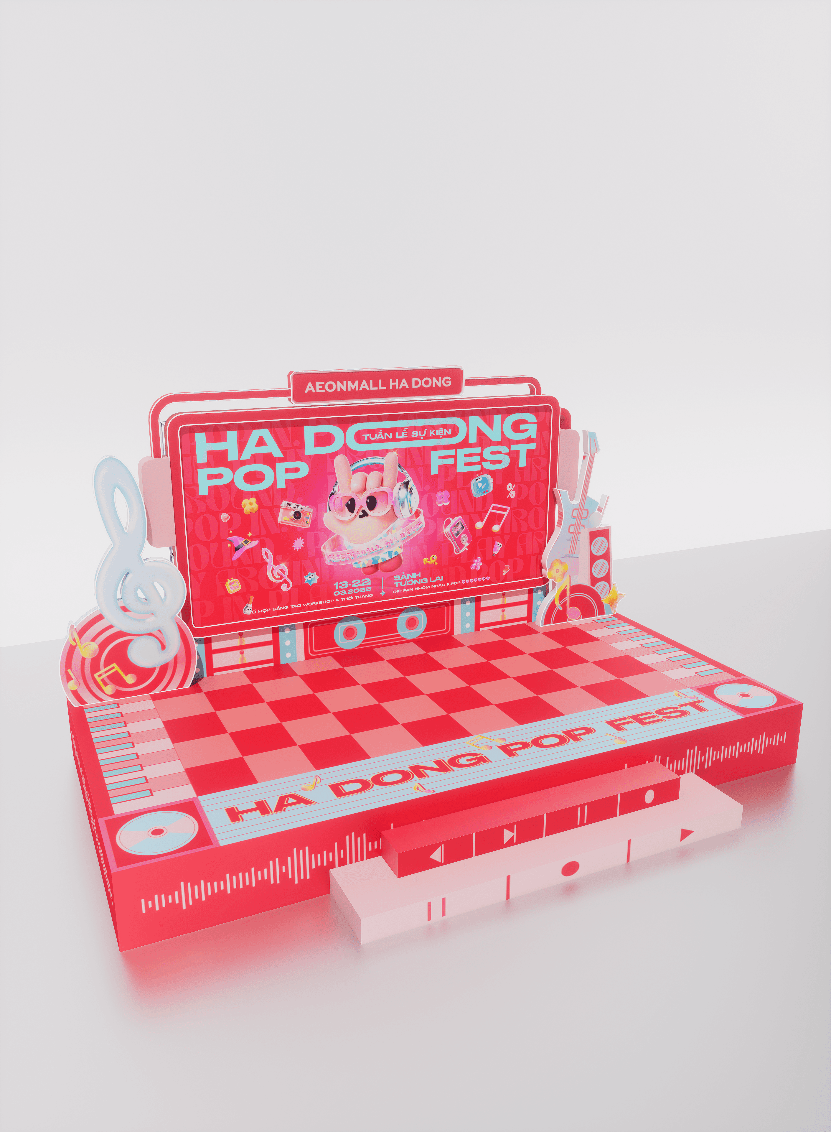 Giai đoạn lên 3D tập trung vào cách người di chuyển trong không gian mall. Vì AEON Mall Hà Đông có cấu trúc thông tầng, Look tính toán để thiết kế sân khấu và các cụm POSM trông thu hút ở mọi góc độ, kể cả khi nhìn từ các tầng trên cao xuống. Các khu vực được sắp xếp đối xứng, tạo ra những lối đi rộng rãi để đón lượng người lớn mà không gây tắc nghẽn. Tỷ lệ của nhân vật "Pop" được tính toán kỹ dựa trên tầm mắt người nhìn, đảm bảo dù khách hàng đứng ở đâu cũng có thể chụp được những bức ảnh đẹp với nhân vật chính. Look bóc tách chi tiết kỹ thuật ngay trên bản vẽ 3D để kiểm soát độ rực rỡ của màu đỏ dưới hệ thống ánh sáng thực tế của mall. Hệ kết cấu được tính toán để lắp ráp nhanh trong đêm, đảm bảo độ chính xác tuyệt đối so với ý tưởng ban đầu.